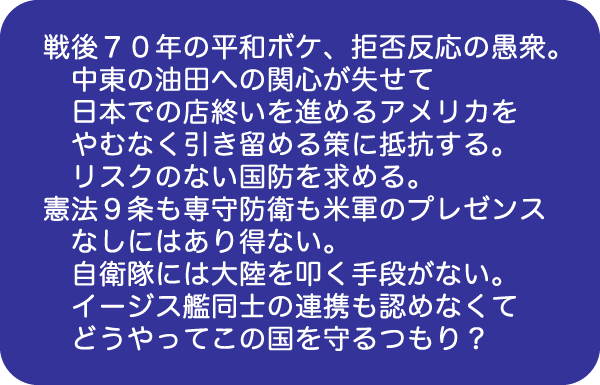 ![]() 1960 年の安保闘争の時も、安保条約を読んだ学生は殆どいなかった。それで「安保反対」と国会前や新宿駅西口大騒ぎして、死人も出した。今回は、安倍 晋三が嫌いとか、日頃の社会への不満のはけ口だったり、「戦争法案」とレッテル付けして反対を叫ぶばかりで、誰も肝心要の「どうやってこの国を守るか」を口にしようとしない。 この法案と運用は「首相の裁量で自衛隊の派遣が決められる」ようにはなっていない。しかし、どの国も最後は行政のトップが決めて、国会の承認も得る。 安保法制は必要。11法案あって条文自体の審議は始まったばかり、ややこしい疑問ばかりだが、野党は目の前で軍拡を進める中国・北朝鮮の問題を無視して、対案も出さない。アメリカは、沖縄の海兵隊を半分以下の9千人にすることにしており、既に在日米軍はスカスカで、国防当局は辺野古も要らないと帰り支度を進めている。朝鮮半島での有事だと69万人の米軍が必要と韓国の国防部は算出。 法案が成立しても、尖閣有事で米軍と共同戦線を組みながら弾薬等の提供は出来ないし、米軍が那覇や佐世保の自衛隊基地への敵の攻撃を阻止しよう行動する中、攻撃されても、日本の存立危機事態ではないから、自衛隊は傍観。日本が攻撃される場合でも、敵が攻撃着手の前なら手出し出来ない。 「武力の行使の新三要件」や「武力攻撃予測事態における先制的自衛権」などの法文上のハドメについては今後 論を詰めて改めるべきは改めたらいい。 以上が嫌だ、“十字軍”には関わりたくないと言うなら、重武装+中立か、重武装+東アジア版NATOなどの集団防衛体制を進めるしかないだろう。中立なら、年間の防衛予算は今の4倍以上の20兆円を下らないとのこと。 この全てに反対する民主党・共産党・社民党には何をか言わんや。