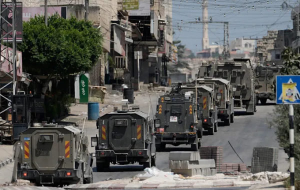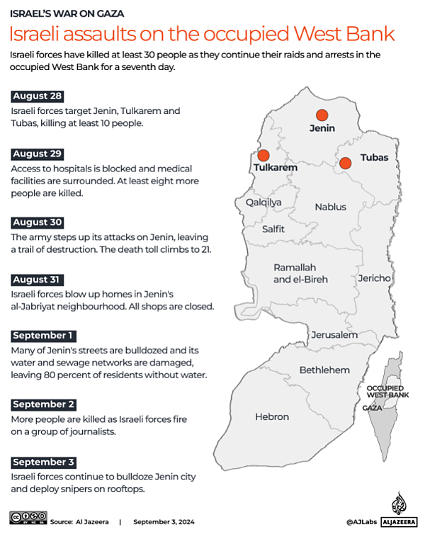イスラエル軍はハマスと連携するイスラム聖戦などが拠点とするのを防ごうと、トゥルカレムにあるアル イスラ専門病院とタベット タベト政府病院を包囲し、救急車の出入りを封鎖。ジェニンの病院に侵入。 アル-ジャジーラは、地元のレジスタンス戦闘員は「弾丸と爆発装置」でイスラエル軍の侵入と戦っている、と。西岸のパレスチナ武装グループは、ガザの武装グループのような火力を持っていない。 アル-ジャジーラが取得し検証したビデオ クリップでは、ジェニンでの激しい銃撃と爆発の音を捉えている。 現在、パレスチナの武装グループは、ヌールシャムスとジェニンの難民キャンプでイスラエル軍と対峙。アル クッズ旅団は「戦闘機がヌールシャムス キャンプで高爆発装置で敵歩兵部隊を標的にした」と述べたが、カッサム旅団は「侵入する戦車に対してジェニンで地元製の高爆発装置を爆発させた」と述べ、イスラエル軍の戦闘機は「占領軍と共に暴力的な衝突に従事している」と述べた。 イスラエル軍はトゥルカルムとジェニンにある難民キャンプに陣取る。 ヨルダン川西岸地区は中部ラマラ県にあるパレスチナ自治政府の支配下にあるが、この大部分はイスラエルによって警察と統治が為されており、イスラエル軍は西岸全域に常駐し、占領されたパレスチナ領土に任意に入ることが出来る。 ここでは、2022 年からほぼ毎日イスラエル軍による攻撃があり、同時に、イスラエル人の入植者らが年でも村でも暴れ回っていて、パレスチナ人を暴行・殺害、民家や車に放火。土地を離れることを強制。