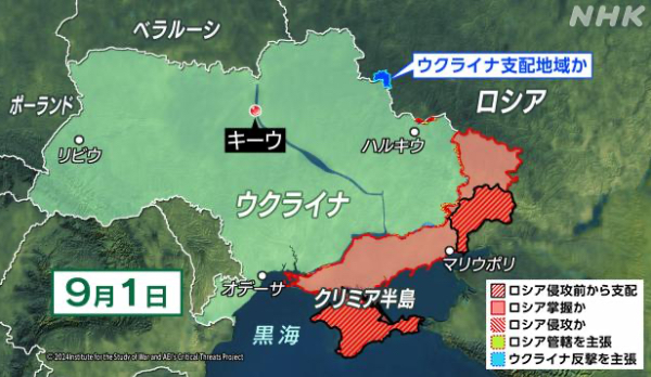 クルスク州では13.3万人以上の住民が家を追われて避難。ウクライナ軍は市街の制圧をやっており、死者もかなり出ているが、不詳。ロシア兵も 1,000 人以上が捕虜に。 ゼレンスキーのこの強硬策は、米欧の支援が望めなくなった戦争で、8/27 会見で述べたように、ジョー=バイデンとドナルド=トランプ氏に今後 自ら提案する予定の終戦計画を有利に進めたいため、と見られる。 だが、8/28、ウラジミール=プーチン大統領(71)は「ウクライナの今回の越境攻撃は無差別だ。市民に犠牲が出ている。そんなところと和平の話し合いは出来ない」と一蹴。 ロシア大統領府報道官のドミトリー=ペスコフ氏も「ウクライナ政権の代表からそのような発言を聞くのは初めてではない。ウクライナ政権の本質は知っている。我々は特別軍事作戦を継続しており、全ての目標を達成する」と切り捨てた。 戦力・兵数に優るロシア軍は、ウクライナ東部のドンバス地方から西南西へサポリージャ州、ヘルソン州(= 南のクリミア半島に隣接)にかけて確実にウクライナ国内に占領範囲を拡げており、ウクライナ側は依然 劣勢。ロシア軍はクルスク州に入った部隊には背後から挟み撃ちも可能。ロシアが今の攻勢を続ければ、ゼレンスキーは敗北して、国外に逃げ出す。 < ロシアが核使用の条件を変更 >