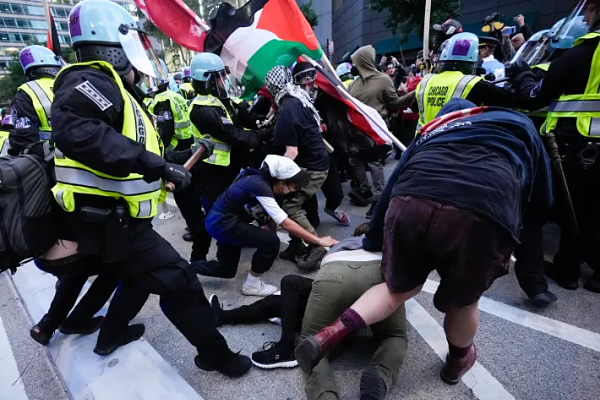 8/21、シカゴ市での民主党全国大会[DNC]の最終日、会場のコンベンションホールの外では、抗議者たちがパレスチナ系アメリカ人のスピーカーがステージに立つことを禁じられたことに不満を募らせた。 カマラ=ハリスはガザ侵攻の問題に踏み込んだが、イスラエルに対するUSAの支援を繰り返しただけ。